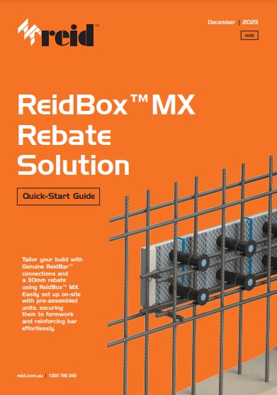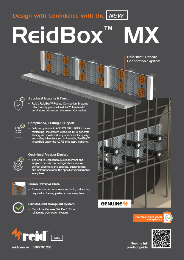 | Reid ReidBox MX Flyer_Structural Engineers _Specifiers | Brochures | Genuine and Compliant system. Part of the Genuine ReidBar™ 2-part reinforcing connection system. Fully compliant with AS/NZS 4671:2019 for steel reinforcing, the system is backed by in-concrete testing and meets industry standards for quality and safet |